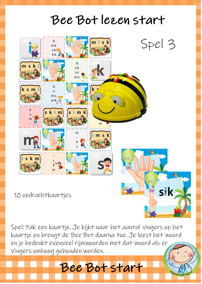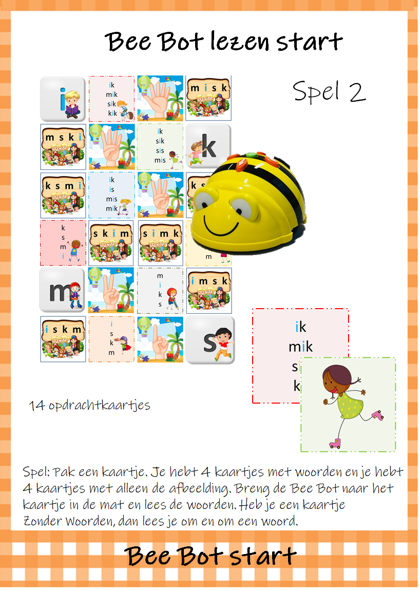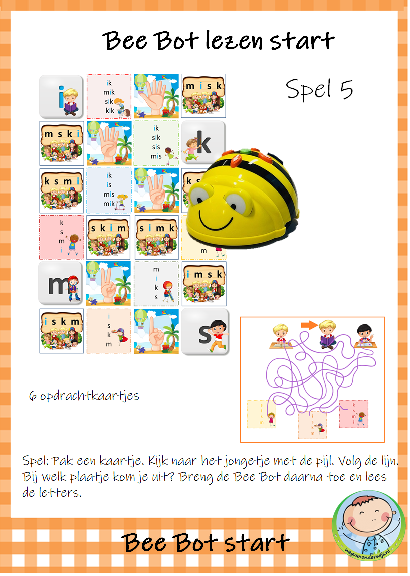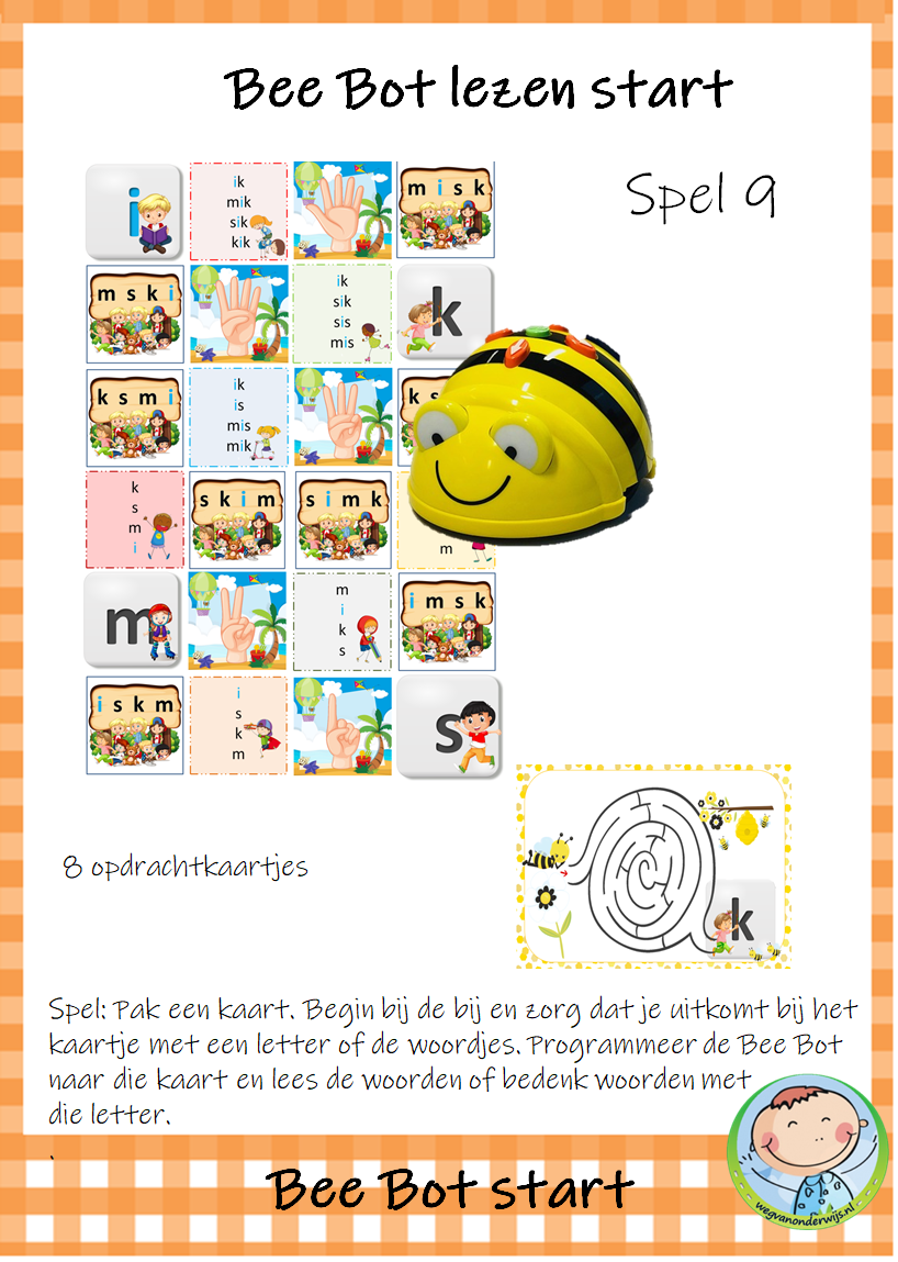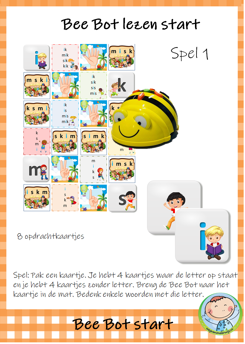 Het pakket bevat 9 spelletjes die je kunt gebruiken met de transparante mat voor de Bee Bot. De kinderen werken met elkaar aan deze werkvormen. De kinderen zijn spelenderwijs bezig met letters, woorden en zinnen. Dit Bee Bot pakket sluit aan bij de methode VLL Kimversie.
