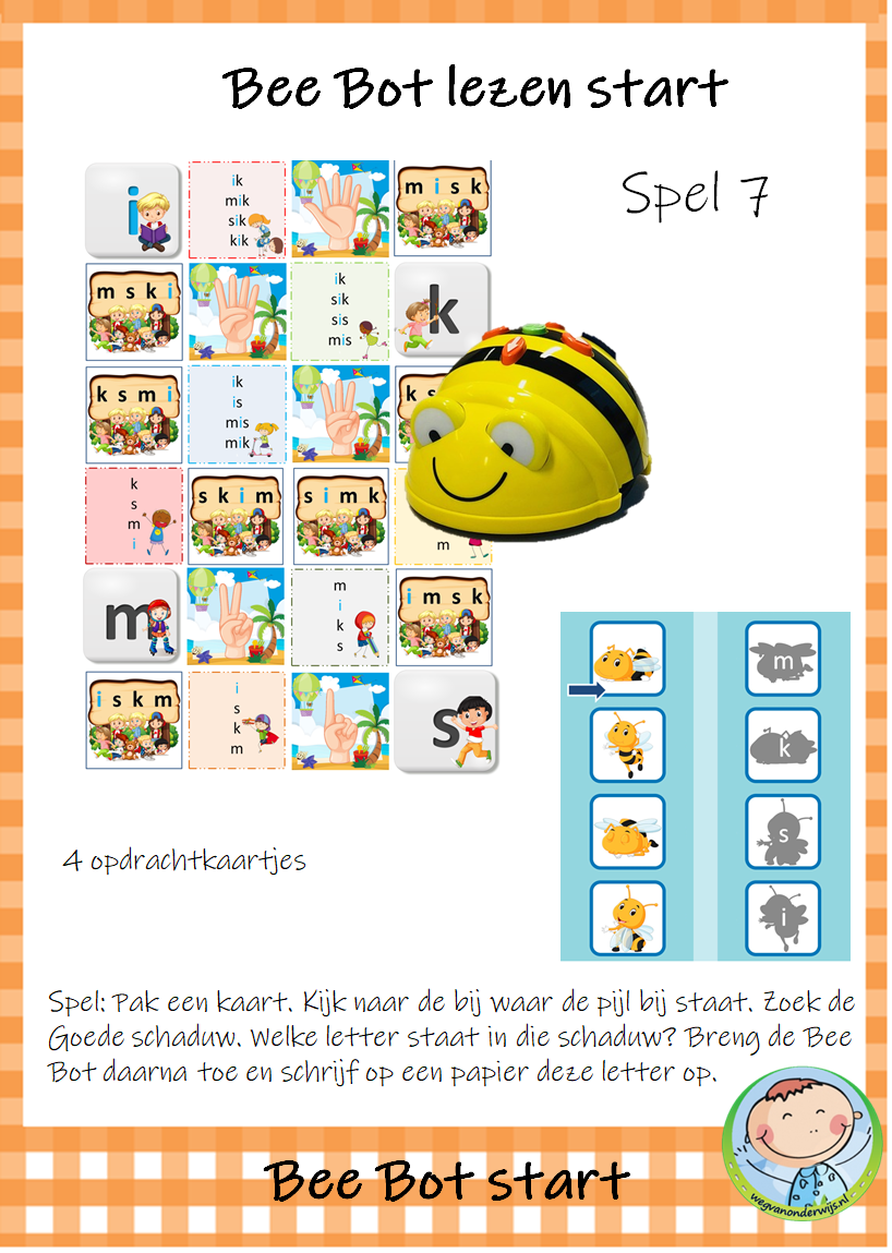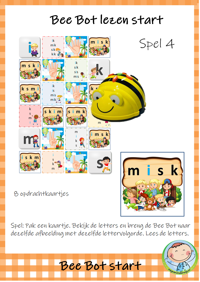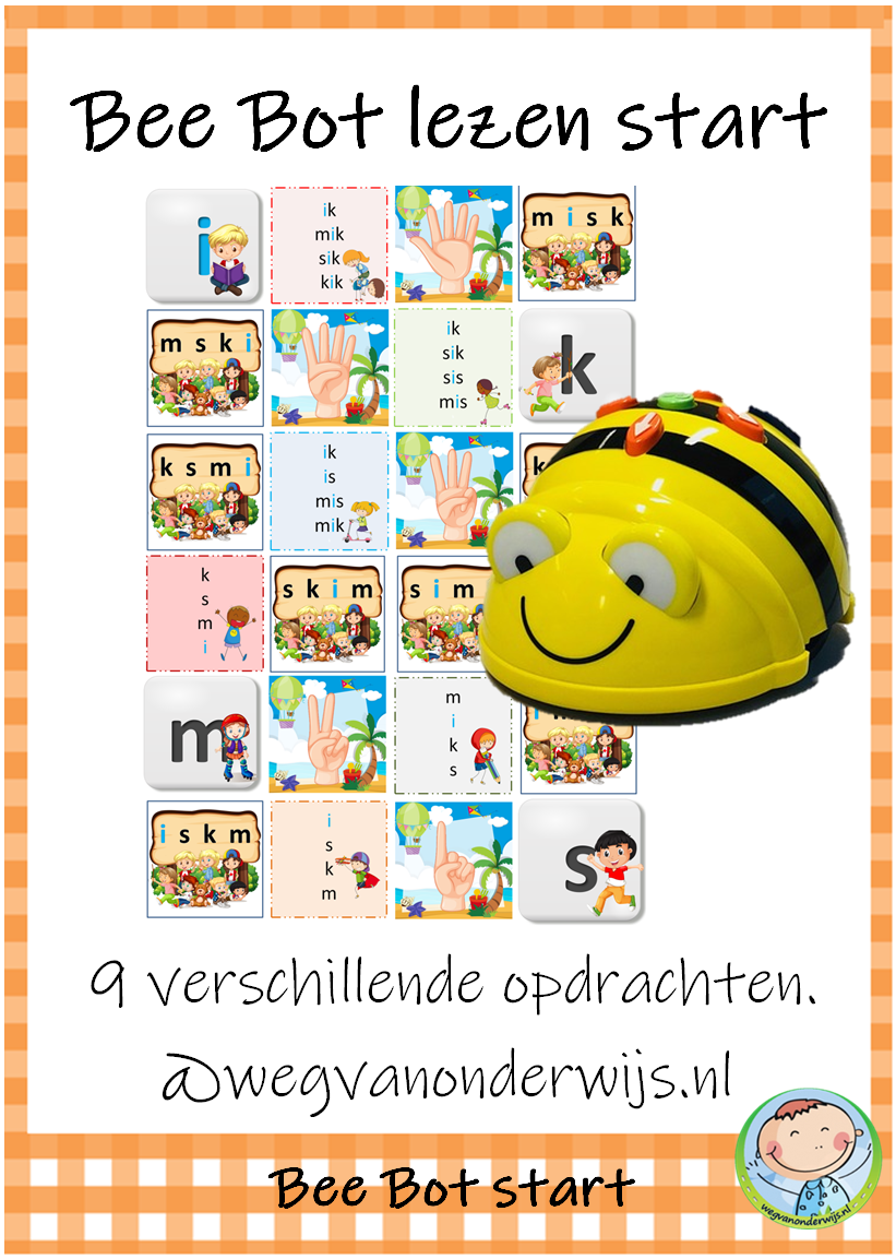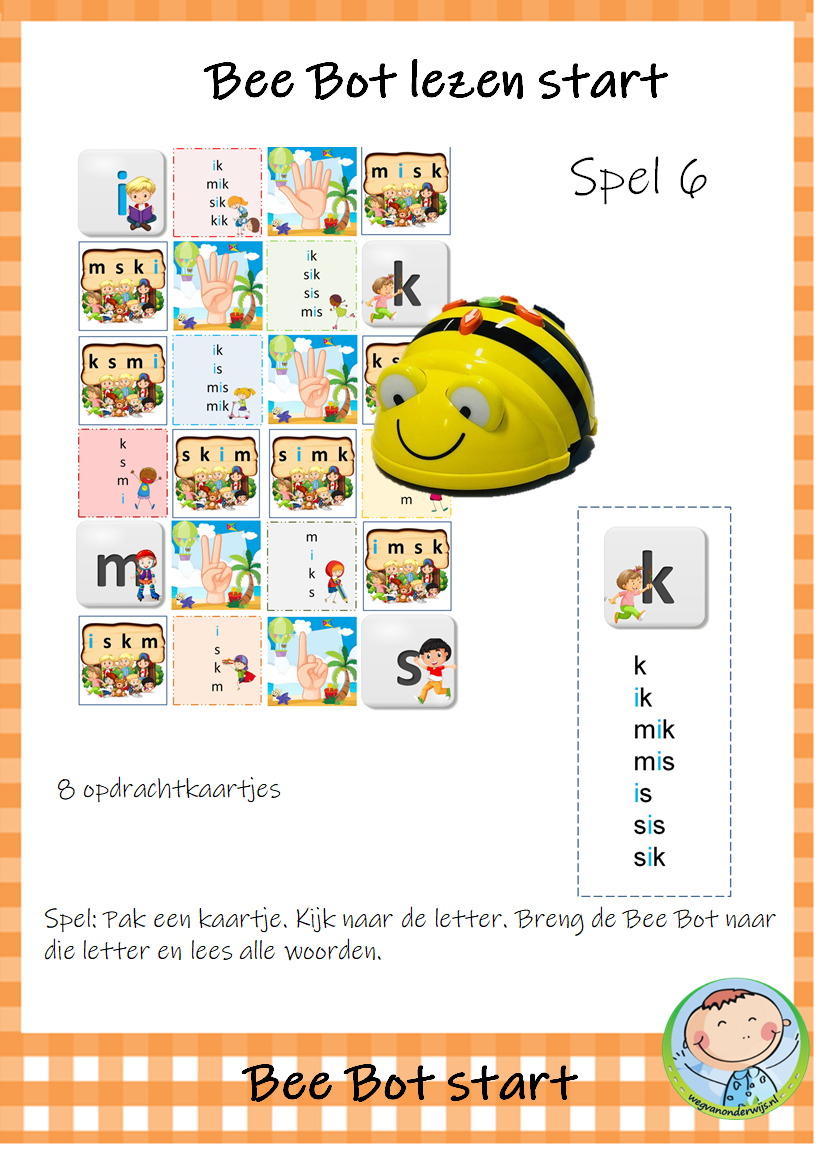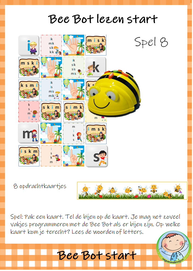 Het pakket bevat 9 spelletjes die je kunt gebruiken met de transparante mat voor de Bee Bot. De kinderen werken met elkaar aan deze werkvormen. De kinderen zijn spelenderwijs bezig met letters, woorden en zinnen. Dit Bee Bot pakket sluit aan bij de methode VLL Kimversie.